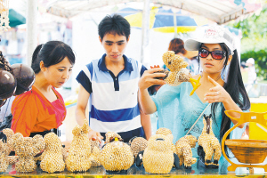 | 6月16日,游客在琼海博鳌镇挑选工艺品。 本报记者 苏晓杰 摄 |