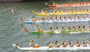 当天清晨,红、黄、蓝、绿、白,五色龙舟在三亚港内准备就绪,来自海警二支队和港内各个捕捞船队的10支参赛队伍整齐列队,200多名参赛队员摩拳擦掌,跃跃欲试。上午8时30分,龙舟赛正式开始。“嘿……呵……”划船队员吼出洪亮的口号,与划船的频率保持一致;“咚咚咚……”鼓手使劲的擂鼓,与清脆的哨声汇成一股声势。
