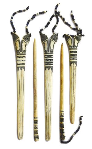 欧宗文说,在海南黎族中也十分流行簪饰,他们运用鹿骨、牛骨或其他兽骨为材料,根据规格、尺寸切成长条状,打磨光滑,用刻刀把人头像及各种花纹、图案精雕细刻在骨簪上。刻好后涂上一层乌烟,渗入刻痕中,再抹上熔化蜂蜡做封闭,刻纹中的乌烟黑迹便清晰地显现出来,黑白相间,十分漂亮。其中,各种图形都含有美好的象征意义,内涵非常丰富。