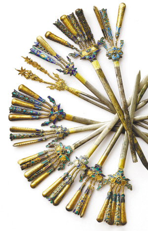 除这套簪饰外,欧宗文还在中和镇收集了许多明清、民国时期的簪饰。惹人注意的是,许多银簪运用了镏金拉丝工艺,一圈圈精美细密的纹路工艺,让人不敢相信这竟出自人工雕刻。欧宗文说,根据目前的藏品考证,海南古代最发达、最流行的簪饰工艺当数中和古镇,尤其珐琅彩和镏金技艺的结合达到相当高超的境界。