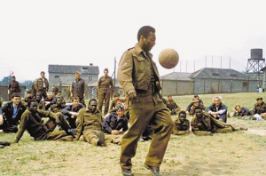 然而,由史泰龙扮演的这位哈奇先生,一开始并没有完全投入比赛,作为一个美军战俘,他甚至不知道英式足球和美式足球的区别。如何顺利飞跃战俘营,才是他关心的事情。然而,眼前的形势,要求他必须加入这支球队,必须发挥自己的能量,让更多的人逃走。这个看上去喜欢打小算盘的美国佬,在关键的时候还是选择了大义。为了联系巴黎地下组织而逃亡,又为了落实地下组织的逃亡方案而只身返回战俘营,他越发意识到自己的使命感。在通往比赛的路上,哈奇进入了守门员的角色,他不断询问伙伴:“如果发角球,我站在那里?要知道,我不懂足球,你要告诉我。”按照事先约定,中场的时候,球员休息室浴池的下水道被地下组织挖开,全部球员可以从这里逃走。出乎意料的是,一个信念在这时升起,“也许我们能赢”。是的,“也许我们能赢”,所有的球员回到了比赛场上,盟军战俘队找回了上半场的所有失球。终场前的哈奇,有如神助,成功扑出了德国人的点球。球场沸腾了,虽然双方比分平分秋色,但是胜负的天平已经在所有现场观众的心中发生了倾斜。人们涌入球场,裹挟着盟军战俘队的球员,向自由逃亡。