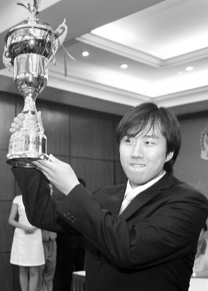 | →6月20日,特级大师卜祥志举起了“中国海南儋州首届国际象棋特级大师超霸赛”冠军奖杯。 本报记者 苏晓杰 摄 |