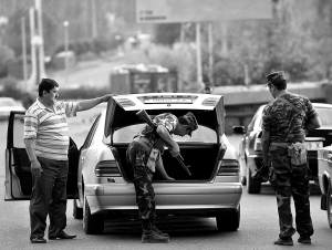 在吉尔吉斯斯坦南部奥什市附近的村庄,警察在检查站搜查一辆汽车。 新华社/法新