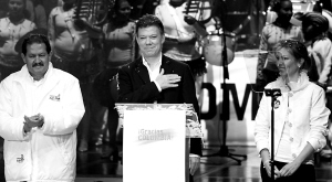 6月20日,哥伦比亚民族团结社会党总统候选人胡安·曼努埃尔·桑托斯(中)在波哥大的竞选总部庆祝当选新一任哥伦比亚总统。 当日,桑托斯在哥总统选举第二轮投票中获胜,当选新一任总统。 新华社发