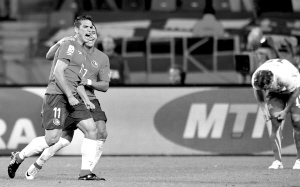 | 智利队球员冈萨雷斯(左)进球后庆祝。