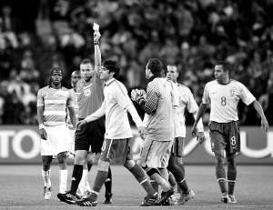 21日,主裁判向巴西队球员卡卡出示第二张黄牌。 新华社发
