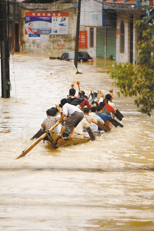 ↑ 6月20日,在被洪水淹没江西余江县城,一群小伙子正在划龙舟。连日来的暴雨洪水导致江西余江县县城受淹,有地区积水超过1.5米。据江西省防总称,目前余江县城洪水位下降,供电未通。 新华社记者 周密 摄