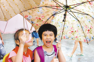 | →6月22日,三亚迎来清凉雨,孩子们欣喜异常。 特约记者 孙清 摄 |