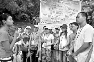 虽然是海南旅游的淡季,但是万宁东山岭旅游景区里,28位刚上岗的景区内部导游却没有闲着。每天下午,等客人们离开,工作了一天的内导们就会集中在一起,接受讲解部经理的培训。他们要熟悉景区的历史和文化,掌握更多的带团技巧,更好地为游客服务。这些内导都是景区附近村庄里的年轻人。他们很珍惜这份工作,他们说,服务好游客,就是在帮自己。