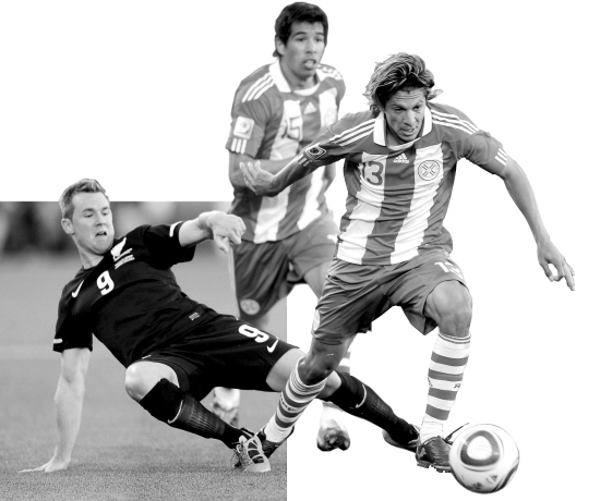 0:0平新西兰队 巴拉圭获小组第一 6月24日,在波罗瓜尼进行的2010南非世界杯小组赛F组第三轮比赛中,巴拉圭队0:0平新西兰队,获小组第一。 图为巴拉圭队球员贝拉(右)在比赛中带球进攻。 新华社发