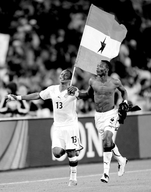 | 24日,加纳队球员安德烈·阿尤(左)和潘西尔在比赛后向观众致意。新华社发 |