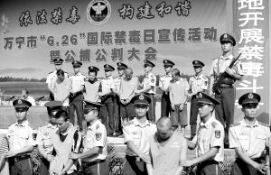 当日,大会公开宣布批准逮捕涉嫌贩毒犯罪嫌疑人8人,公开宣判贩毒犯罪案件共10件10人,贩卖毒品罪犯分子分别获有期徒刑一年至四年不等,并处罚金额1000至2000元不等。
