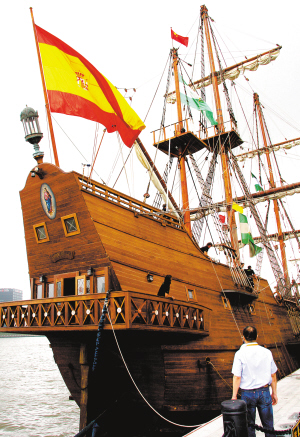世博之窗 6月24日14时许,西班牙“安达卢西亚号”仿古帆船抵达上海国际客运中心码头,它将作为西班牙及安达卢西亚大区的“水上展馆”接待游客参观。 “安达卢西亚号”是一艘十七世纪往返于亚洲和美洲航线的西班牙三桅帆船复制品,全长52米、宽10.1米、主桅高40米,船帆总面积达965平方米,并配有10门铁炮,是当时海上最大的商用帆船。“安达卢西亚号”将在上海停留两个半月,期间将参加一系列世博会等文化交流活动。 新华社记者陈飞摄