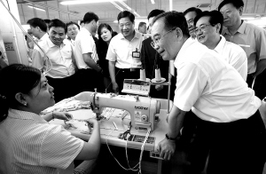 | 6月25日,温家宝在杭州祥润制衣有限公司生产车间与工人交谈。 新华社发 |