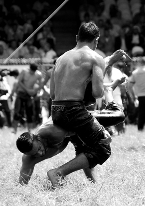 6月21日至27日,一年一度的传统柯克珀纳尔涂油摔跤节在土耳其西部城市埃迪尔内举行,近1500名摔跤手参加比赛。 土耳其的橄榄油摔跤赛至今已有649年的历史,据传说,这项赛事是为了纪念两名勇猛剽悍的奥斯曼帝国士兵,他们在经过整整一天的角力后终因体力耗尽而死。此后,在两人被埋葬的柯克珀纳尔每年都要举行类似的摔跤赛。 这项运动因参赛者赤裸上身和脚,只穿一条紧身皮裤,全身上下包括皮裤都要涂满橄榄油而得名。 新华社记者陈铭摄
