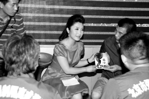 | 刘媛媛(左)送专辑给戒毒人员 |