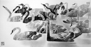 我发现,汤先生几乎每隔一段时间就会大变一次。正是因为他阅历丰富,涉足的中外艺术知识广博,所以他在进行艺术创作时,能够轻松自如地跨越东方文化与西方文化的界限,精英文化与大众文化的界限,水墨与其它画种———如油画、版画、装饰画的界限,并由此形成他独特的艺术面貌。而他最近创作的水墨画则达到了前所未有的高度。他的聪明之处是:并不是被动地用毛笔或宣纸去画西画,一方面将西画的一些艺术元素很好地转化为水墨画的表现方法;另一方面,又从传统的民间绘画———如木刻年画、剪纸、陶瓷中智慧地转化出一套全新且具有个人特点的表现方法。如果要具体地加以说明,我认为第一是运用了空间错位的手法;第二是强调由直线向曲线的转换;第三是突出造型上大气、稚拙的趣味。其实,这三点也是造成汤集祥先生的作品既有现代感,又有中国特点的原因。