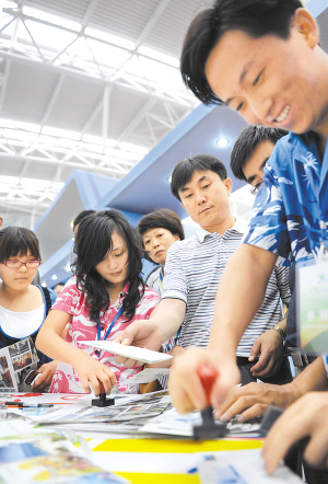 | 六月二十八日,中国·天津第十七届投资贸易洽谈会上,海南馆数百张海南风光明信片被天津群众索要一空。图为工作人员在为明信片加盖“国际旅游岛戳”。