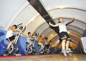 ②7月1日,孩子们在合肥一处人防纳凉点健身运动。当日,合肥市滁州路、新蚌埠路两个人防纳凉点开始免费接待市民。这两处防空洞纳凉点功能齐全,可为市民提供休闲、健身等多种服务。 新华社发(虞俊杰 摄)
