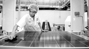 | 海口国家高新区狮子岭的英利光伏产业园,英利集团技术员在擦拭刚下线的多晶硅太阳能产品。 本报记者 李英挺 摄 |