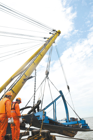 7月1日,两名施工人员查看海底电缆敷设情况。 当日,平潭110千伏二回通道A相海底电缆正式开始敷设。等到随后的B相、C相海缆敷设完成,平潭电网将进入“双线双变”时代。 新华社发(郭洋摄)