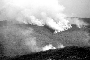 这是大兴安岭火场林地形成的多个烟柱(7月2日摄)。 新华社记者王松摄