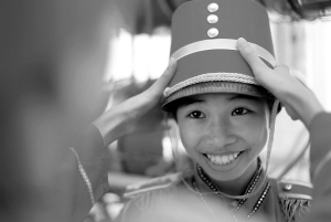 | 六月二十九日,白沙思源学校,一位黎族女孩参加了学校仪仗队,崭新的队服队帽让她欣喜好奇。 |