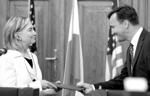 7月3日,在波兰举行的波美导弹防御系统补充协议签字仪式上,美国国务卿希拉里(左)和波兰外交部长西科尔斯基交换协议文本。