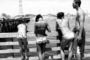 ↑ 7月4日,人们在美国纽约康尼岛海滨消暑纳凉。