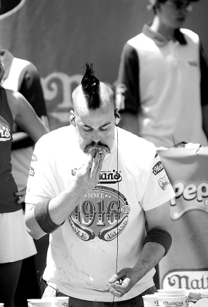 | ← 7月4日,在美国纽约,一名选手参加“内森”国际热狗速食大赛。