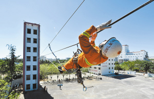 7月5日,海口市消防支队特勤一中队训练场上,消防战士正在进行“攀爬横渡”科目的训练。入夏以来,为提升部队战斗力,省消防总队在全省各基层中队开展了打造消防铁军训练。 本报记者 宋国强 通讯员 郑布雄 摄