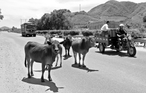 本报讯 (记者张杰 实习生李健)坑洼积水、车辆逆行、牛群横行、三轮车飞驰……这些时常发生在落后山村道路上的现象,如今在我省西线高速公路乐东九所至三亚段时有所见,令人惊心。