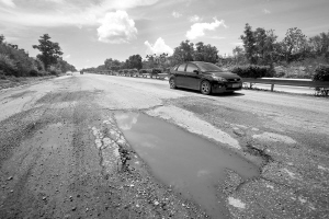 从302公里处开始,数十公里长的路面随处可见碎石块,柏油路面被压出一个个大坑,坑里有积水,大坑的边上被挤出一道道高约10厘米的凸块,一不小心就容易刮到车底盘。划分行车道的白线不仅扭曲变形,有些甚至已消失。在这些坑洼之中,李师傅不仅要减慢车速,还要不停急打方向盘,变换车道,沿S形路线行驶。