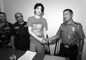 | 吴锡利(右二)在当地警察局和一名警官握手。 新华社发 |