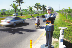 7月6日,一位静态仿真警察手托仿真摄像机,在海口市粤海大道24小时“上岗执勤”。据介绍,日前,海口市交巡警支队在事故隐患多的粤海大道、绕城高速公路等路面,新安装了10位仿真警察。还有10位仿真警察也将在近日陆续安装。其目的是增强路面警示效果,正确引导过往车辆文明安全行驶。 本报记者 苏晓杰 特约记者 陈世清 摄