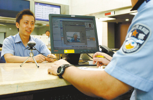 7月6日,一办证市民正接受“重庆市公安局出入境人像识别系统”的核查。当日,重庆警方自行研发的“重庆市公安局出入境人像识别系统”正式投入使用,该系统只需要1.5秒的时间就可以对比系统中150万份身份资料,大幅提升了警方发现、挡获违规办理出国境证件的能力。 新华社记者 陈诚 摄