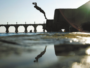 7月6日,在俄罗斯避暑胜地索契,一名游客跳入海水中。新华社/法新
