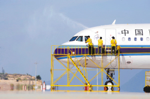7月7日,在三亚机场的停机坪上,南航工作人员给飞机“冲凉”。 当日下午,三亚机场地面温度高达48摄氏度,南航机务人员为停机坪上的飞机“冲凉”降温,达到节约燃油的目的。 新华社发(徐勤涛 摄)