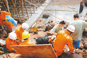 7月7日,重庆渝北区空港广场一深约7米的地下工程因连日暴雨出现边坡垮塌,施工现场有4人被埋。消防官兵第一时间赶往现场进行施救工作,经过努力,现场救出2人,另外2人当场死亡。 新华社发