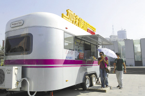 北京地铁刘家窑站旁的房车便利店,距地铁站站口不足10米,便于过往乘客选购商品。从6月28日开始,位于北京地铁站北新桥站、和平西桥站和刘家窑站的房车便利店陆续开始了试营业。房车便利店采取窗口交易的方式,并可使用“公交一卡通”刷卡支付。 新华社发(张宇 摄)
