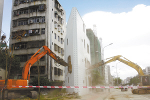 | 两辆挖掘机正在拆除“楼薄薄”。 本报记者 张杰 实习生 李健 摄 |