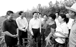考察途中,看到路边农田里绿油油的玉米已有一尺来高,胡锦涛让停下车来,沿着田垄走进田间,仔细察看玉米长势。几位正在施肥、除草的农民见到总书记,个个喜出望外,纷纷围上前来。胡锦涛同大家亲切聊了起来,问夏粮的收成、售价,问气候对玉米生长的影响,问对中央政策还有什么要求。总书记对乡亲们说,扶持粮食生产是国家的长期政策。国家正在制定“十二五”规划,“十二五”期间我们将继续把解决好“三农”问题作为重中之重,今后扶持粮食生产这一政策的力度只会加大、不会减弱。这么做,就是要让乡亲们放心种粮,通过种粮实现增收致富。听了总书记的话,大家连声感谢党的好政策。