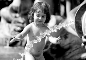 | 7月11日,一名女孩在德国柏林市中心亚历山大广场的海神喷泉戏水。10日和11日,德国度过了今年最热的一个周末,一些地区最高气温达到39摄氏度。 新华社记者 班玮 摄 |