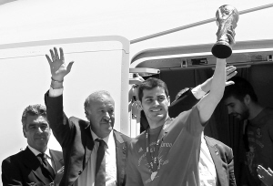 7月12日,南非世界杯新科冠军西班牙队乘坐包机返回祖国,抵达马德里巴拉哈斯机场。图为队长卡西利亚斯(右)高举“大力神杯”和主教练博斯克走出机舱。 新华社发