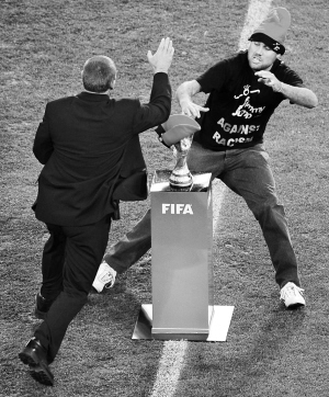 7月12日,一名球迷赛前冲入放置“大力神杯”的场地内,被保安人员驱逐。 新华社发 大力神杯 的诱惑
