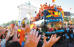 本报讯 西班牙当地时间7月12日15时,西班牙队乘飞机抵达西班牙首都马德里。回到马德里之后,西班牙队全体队员先是参加了国王卡洛斯举行的欢迎仪式,在仪式结束后,他们来到马德里街头和球迷一起欢庆夺冠。 在西班牙队进行游街几个小时之前,马德里街头就已经万人空巷,球迷们身穿西班牙国家队的战袍等待自己心中英雄们的到来。西班牙队队员们由队长卡西利亚斯率领,高举着大力神杯,在一辆大巴车的顶棚上和球迷们一起分享着胜利的喜悦,在游街期间,还有特技飞行表演助兴,整个马德里乃至西班牙成为了一片欢乐的海洋。 西班牙夺冠后,西班牙各地球迷尽情狂 欢,但不幸的是乐极生悲,据当地警方介绍,在球迷狂欢中,有两人死亡百人受伤。由于狂欢中发生暴乱,还有数十人被警方抓捕。 据西班牙媒体透露,西班牙与荷兰的世界杯决赛中,当伊涅斯塔加时赛最后时刻攻入致胜一球后,一名西班牙男子因兴奋过度,而跳楼自杀。 此外,西班牙当地警方透露,在埃斯特雷马杜拉省的埃吉胡埃拉,庆祝的人群跳进市游泳池内疯狂,最终酿成一人死亡的悲剧。在西班牙巴塞罗那市,在户外看球的球迷因过于兴奋,造成局部混乱,导致70余人受伤,在当地警方一份报告中显示,有21人送至医院治疗,还有21人被当地警方抓捕。 与巴塞罗那市一样,瓦伦西亚也发生了骚乱,西班牙捧杯后,球迷酗酒在街上闹事,据悉大约有50名球迷被送至医院接受治疗。 (小托) |