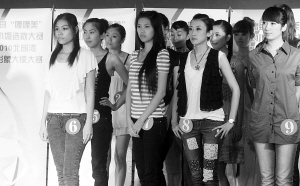 | 7月14日,临高县“哩哩美”形象小姐选拔大赛暨2010北部湾城市形象大使大赛在海口进行复赛。图为在复赛中晋级总决赛的选手集体亮相。 本报记者 陈德雄 摄
