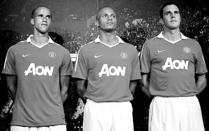 美国当地时间7月14日,英超曼联队新赛季战袍首次在芝加哥耐克城亮相。图为曼联球员奥伯坦、布朗、奥谢身披新战袍。 小新发