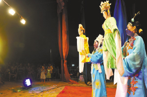 7月10日晚8时,临高调楼镇黄龙上村的村民们,又准时聚集到村委会旁边的大舞台前。戏台后,临高县木偶剧团的演员们已准备停当,古装人偶剧《薛莲灯》即将上演。