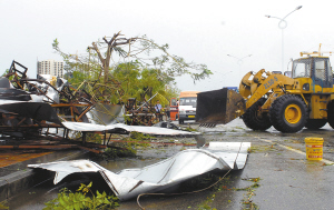 今晨4时50分,停靠在三亚的工程船“浙普工2038”一锚链断裂,船舶走锚现象严重。三亚海事局及时救助,船上船员11人无一伤亡。但令三亚市三防办负责人遗憾的是,尽管作了种种防范措施,仍有两人在台风中意外死亡。一名是摩托司机,另一名是工地保安,均被倒塌的广告牌砸中死亡。